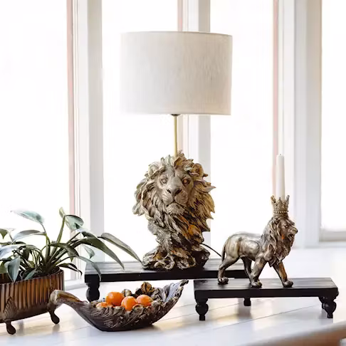 Denna ljusstake i formen av ett lejon med krona på huvudet ger en lekfull touch på inredningen. Tillverkad i poly.