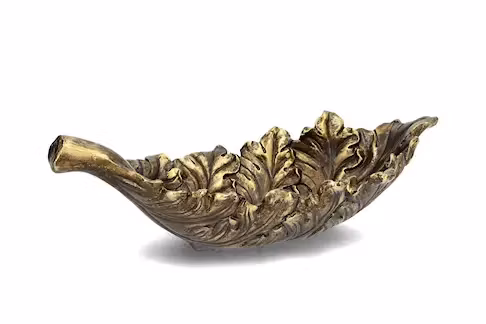 Skål formad som ett blad. Dekorativ detalj att ha på en bänk eller ett soffbord. Tillverkad i poly.